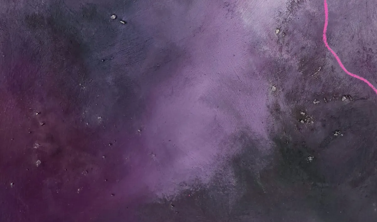 This picture shows a close-up from the bottom of the artwork, highlighting its details. You can see tiny flakes of texture paste accented with metallic acrylic paint. They are scattered across the painting, giving the artwork a special sense of depth.