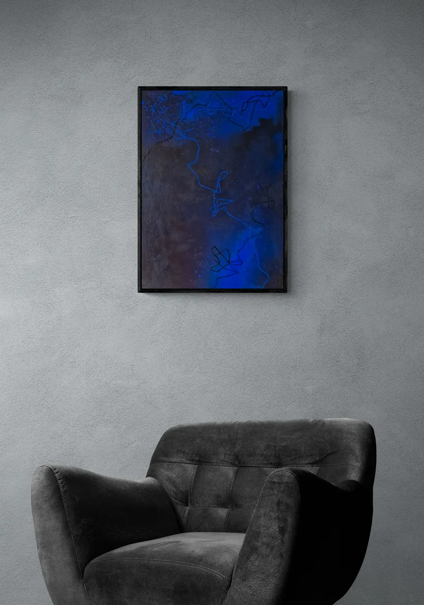 This close-up picture shows the custom two-tone frame I designed for the painting. From the front, the frame appears as a classic black border, but a bold blue side surface becomes visible when viewed at an angle. The frame's design enhances the artwork's dimensionality, reflecting the painting's colors and adding a dynamic 3D visual effect.