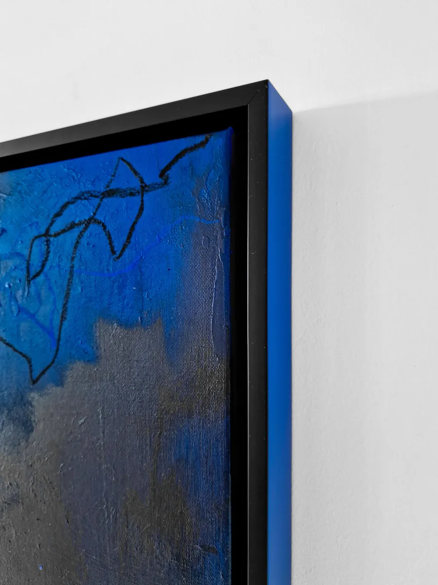 This close-up picture shows the custom two-tone frame I designed for the painting. From the front, the frame appears as a classic black border, but a bold blue side surface becomes visible when viewed at an angle. The frame's design enhances the artwork's dimensionality, reflecting the painting's colors and adding a dynamic 3D visual effect.